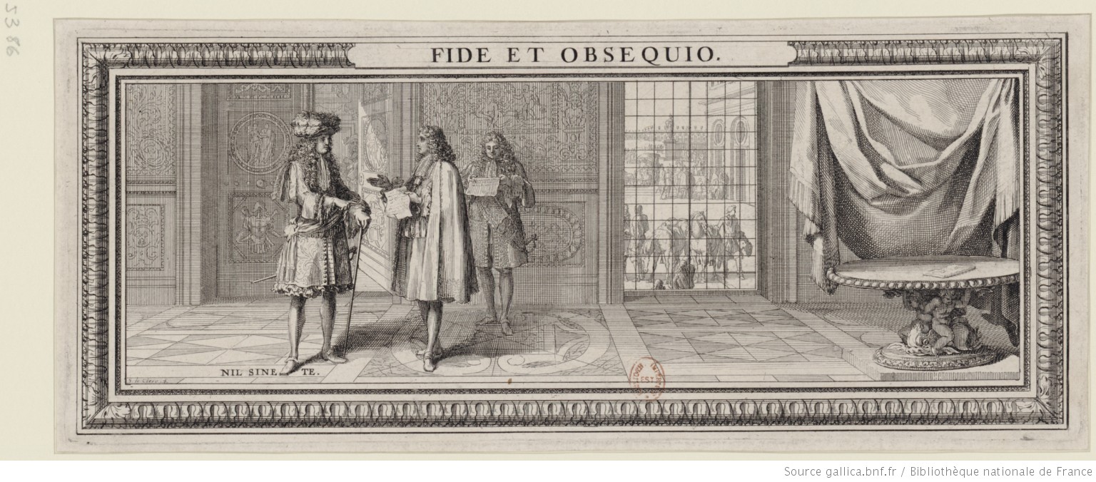 Colbert en presencia de Luis XIV, presentándole una solicitud. Algo retirado, Louvois espera, con algún documento en la mano. Y se lee: “Fide et Obsequio” (Lealtad y Sumisión); y, a los pies del monarca: “Nihil sine te” (Nada sin ti). BnF.
