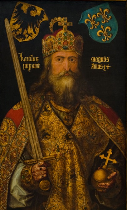 Carlomagno (747-814): De la dinastía carolingia, y héroe de canciones de gestas, era hijo de Pipino el Breve. Rey de francos y lombardos, con Aix-la-Chapelle (Aquisgrán), como residencia habitual y notable foco de cultura (École du Palais). Dueño del norte de Italia, vasaliza Baviera y somete a frisones y sajones. En la Navidad del 800 fue coronado Emperador.